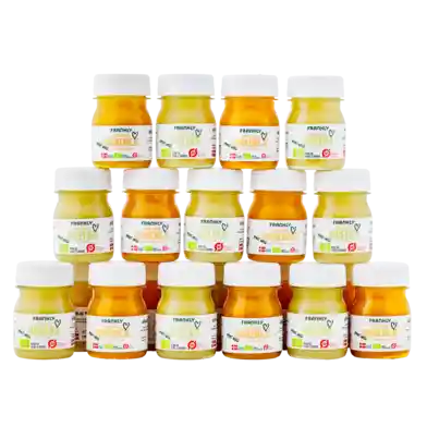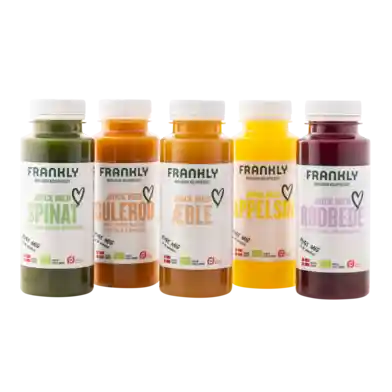 15 flasker juice, ekskl. pant | 15 flasker juice af frisk, koldpresset frugt og grønt. Du får 3 forskellige slags juice i kassen