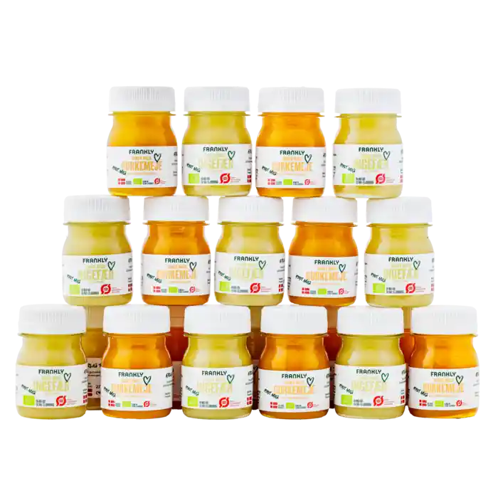 Shots lavet på en base af frisk, koldpresset ingefær. Du får 10 flasker ingefærshots og 10 flasker gurkemejeshots.