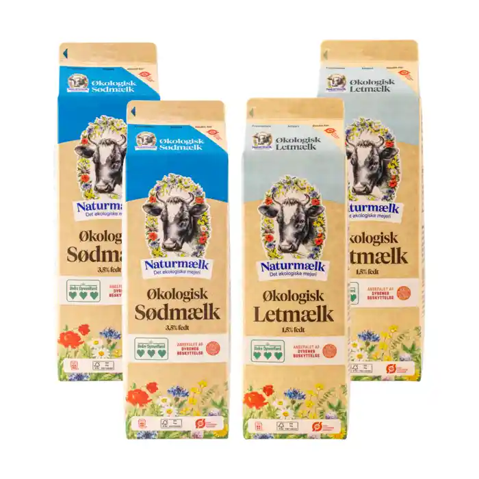Økologisk letmælk (1,5%) og sødmælk (3,5%) fra Naturmælk, 2 liter af hver.