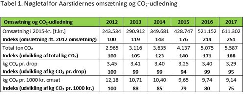 I 2012 udledte Aarstiderne 2.965 ton CO₂, hvilket i 2017 er steget til 5.587 ton CO₂. I samme periode er omsætningen steget 2½ gang, og dermed får flere danske og svenske husstande kasser leveret fra Aarstiderne. Ser man på kg CO₂ pr. drop, er dette tal faldet i den samme periode, mens antallet af kasser, der leveres pr. drop er steget støt. Den største post i CO₂-regnskabet er klart transport med knap 2/3 af CO₂-udledningen i 2017, derefter kommer posterne energi og emballage.