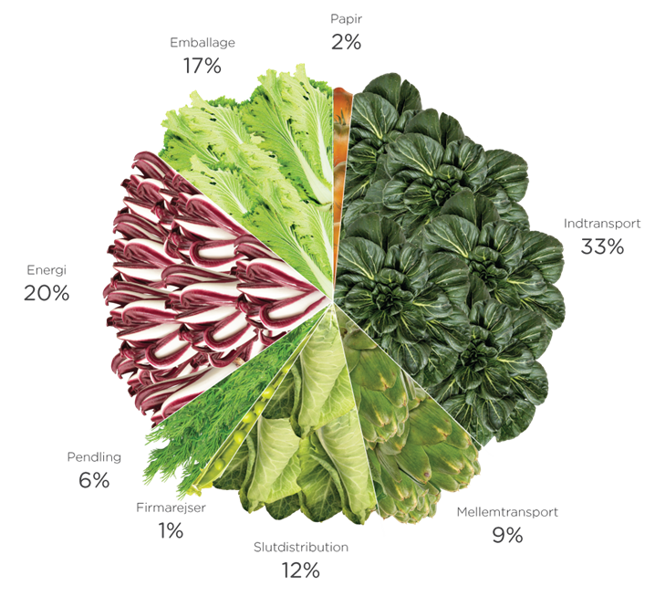 Aarstidernes forretning og levering af økologiske fødevarer består groft sagt i at udvælge og købe varer hjem, pakke dem i en kasse og køre dem hjem til jeres køkkendør – her fylder transporten en pæn del. Varetransport (ind-, mellem- og sluttransport) fylder hele 54%. Lægges persontransport med firmarejser og pendling oveni udgør transport 61%. Resten går til vores produktion. Her er energiforbruget den største post med 20%, der går til køleanlæg, der holder varerne friske, el til maskiner og opvarmning af kontorer m.v.